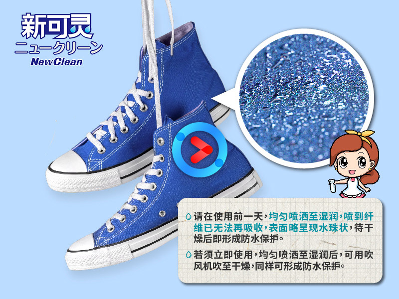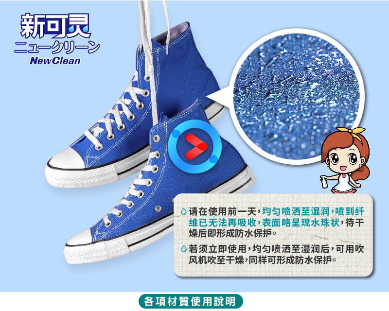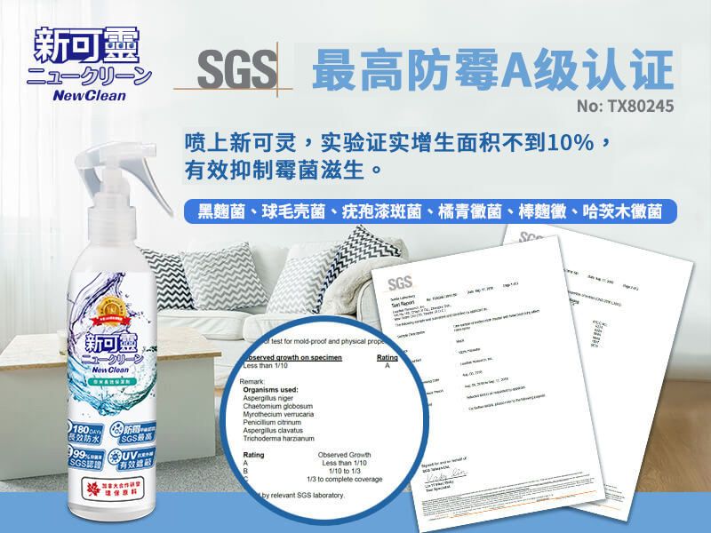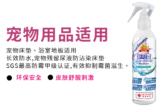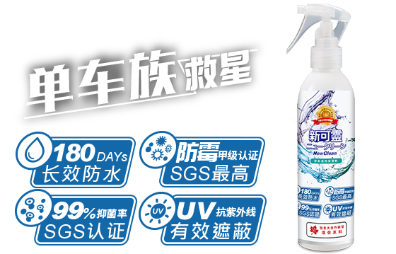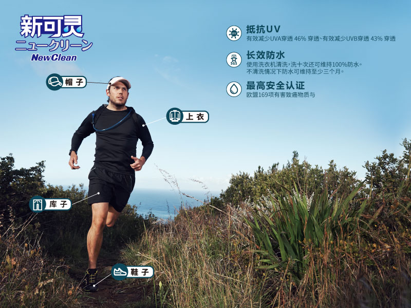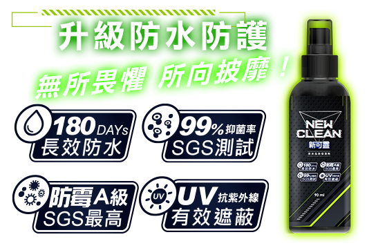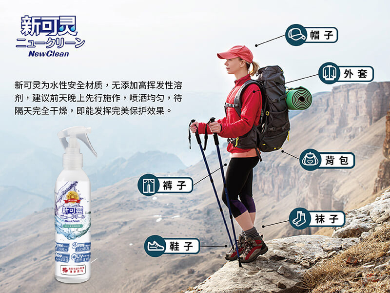 NewClean新可灵奈米长效保洁剂采加拿大合作研发环保原料,以物理性的方式,可在物品上形成奈米涂层的保护膜,并具有抗污阻菌的功效。通过SGS欧盟REACH认证:不含169项有害致癌物质,环保无臭抗UV、通气性强、不伤表面,这些独特的效能,更将新可灵从防水喷雾从人身部品乃至运动服饰、装备的保养范畴,提升至居家生活的保洁防护必备品。