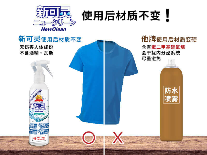 市售的防水喷雾品牌众多,多半为了使用方便与加速干燥,在包装上使用气罐式的喷雾罐,但这种包装容易含有可燃性气体,使用时如稍有不慎,可能惹火上身。因应上述使用安全考虑,「NewClean新可灵奈米长效保洁剂」,采用非气罐式包装,将防水分子奈米化并溶于水中,形成长效防水抗污保护层,大幅增加防水效果、并保留透气度。虽干燥速度较慢,但效果却比传统防水喷雾产品更好。