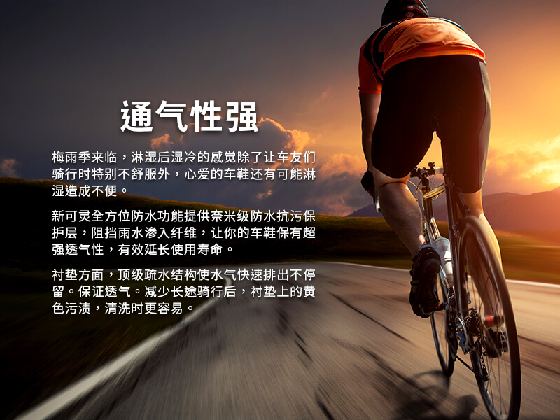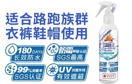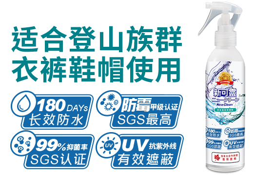 近期NewClean新可灵更是通过SGS新的认证,实验证实喷上新可灵后,24小时内的金黄色葡萄球菌、肺炎链球菌、大肠杆菌、绿脓杆菌、白色念珠菌减菌率>99%,可有效抑制细菌孳生。不论是骑乘单车的车鞋或登山专用的登山鞋,喷上新可灵皆可防霉抑菌,延长鞋子使用寿命。运动时若突然遇下雨,新可灵还可提供奈米保护,阻挡雨水进入纤维,让鞋子保有超强透气,没有水气细菌无法孳生。